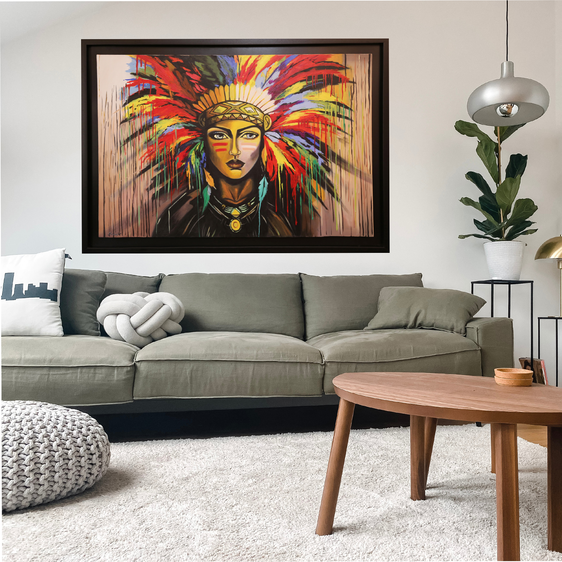 Ein kraftvolles Porträt voller Ausdruck und Farbintensität – dieses handgemalte Unikat fängt die mystische Aura eines Stammeskriegers in abstrakter Form ein. Die leuchtenden Farben und der dynamische Pinselstrich verleihen dem Werk eine beeindruckende Tiefe und Präsenz. Ob im Wohnzimmer, Büro oder Showroom – dieses Gemälde zieht alle Blicke auf sich und verbindet kulturelle Symbolik mit moderner Kunst.