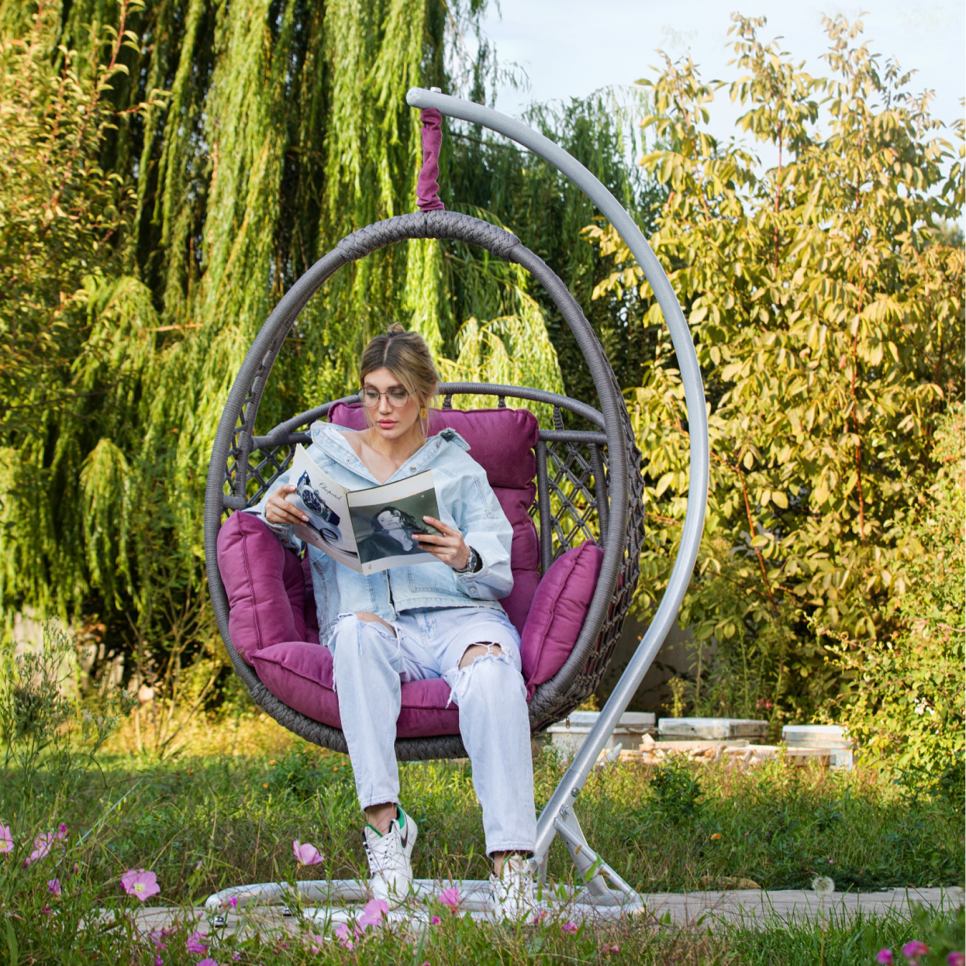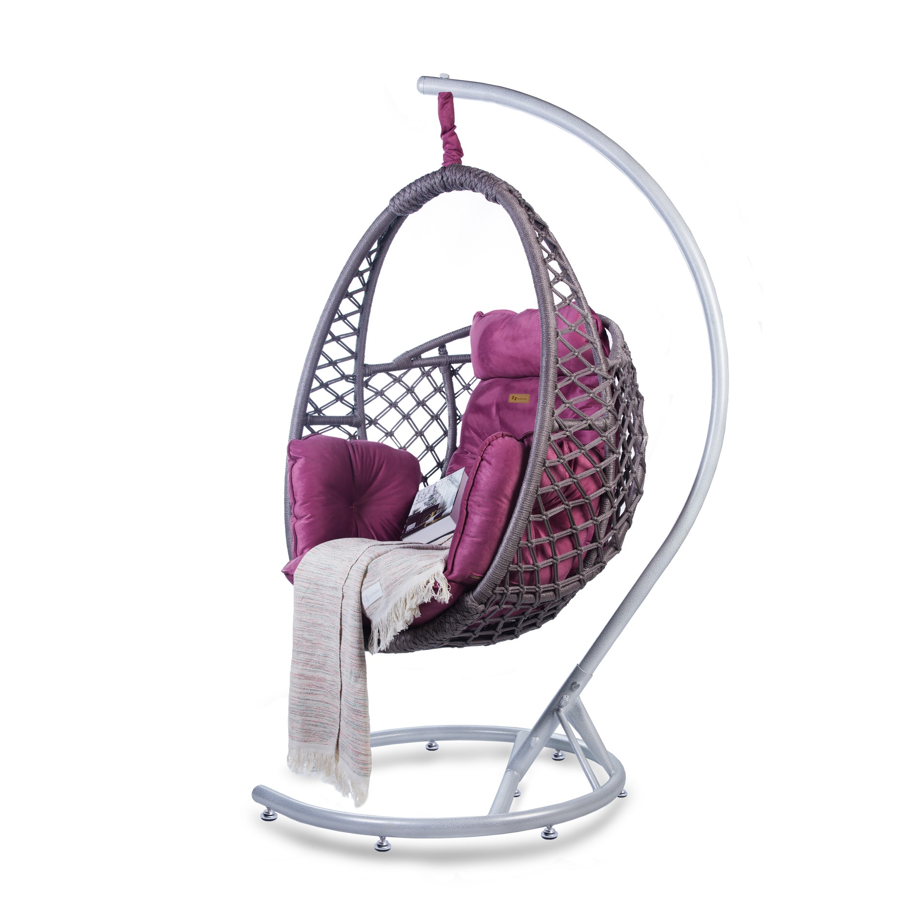 Erleben Sie ultimative Entspannung, Komfort und Stil mit dem NIMAXES Matrix Hängesessel. Dieser einzigartig gestaltete Schaukelstuhl bietet einen gemütlichen Rückzugsort, an dem Sie entspannen, den Himmel betrachten oder Ihr Lieblingsbuch lesen können. Mit dem weichen, lila Kissen und dem geräumigen handgefertigten Korb bietet der Matrix Schaukelstuhl außergewöhnlichen Komfort und lässt Sie das Gefühl erleben, über den Wolken zu schweben.