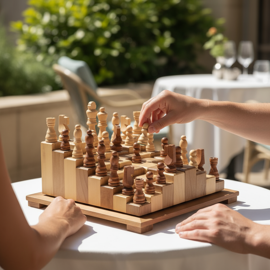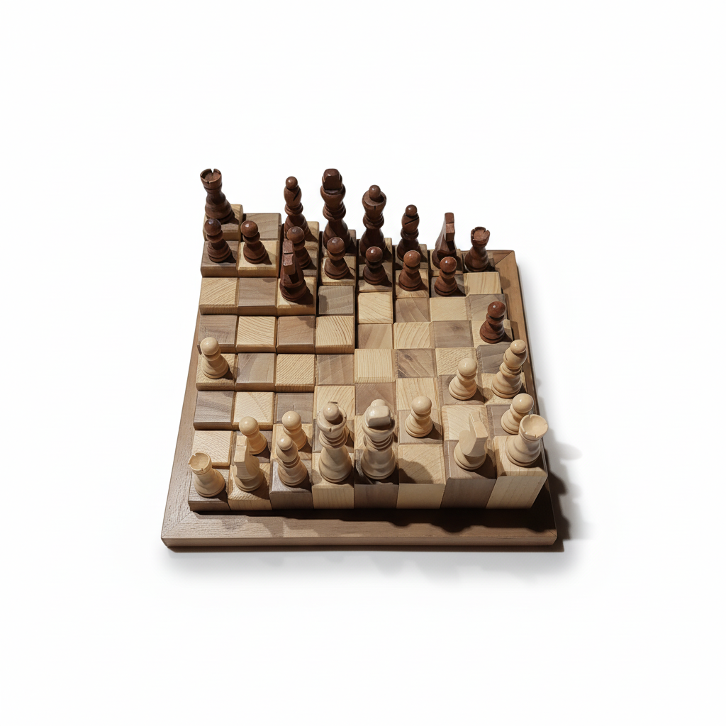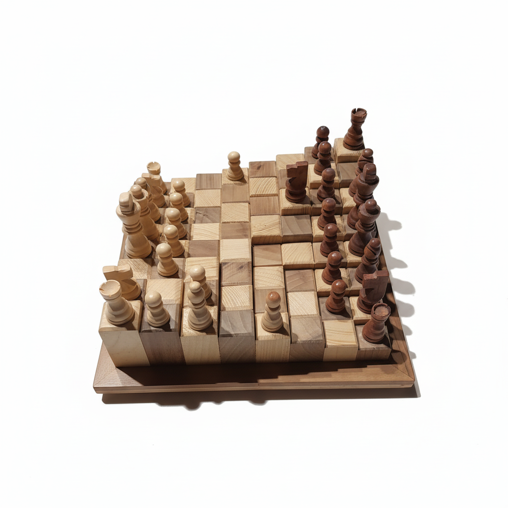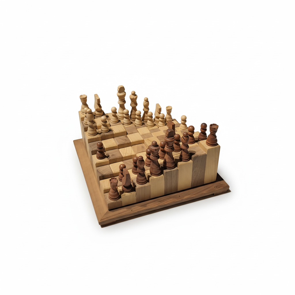 Dieses handgefertigte 3D/gestufte Schachbrett aus Walnussholz ist ein Design-Statement und Spielfeld in einem. Jede Stufe betont die natürliche Maserung, erzeugt Tiefe und macht jeden Zug haptisch erlebbar – ideal für Wohnzimmer, Büro oder Lounge.