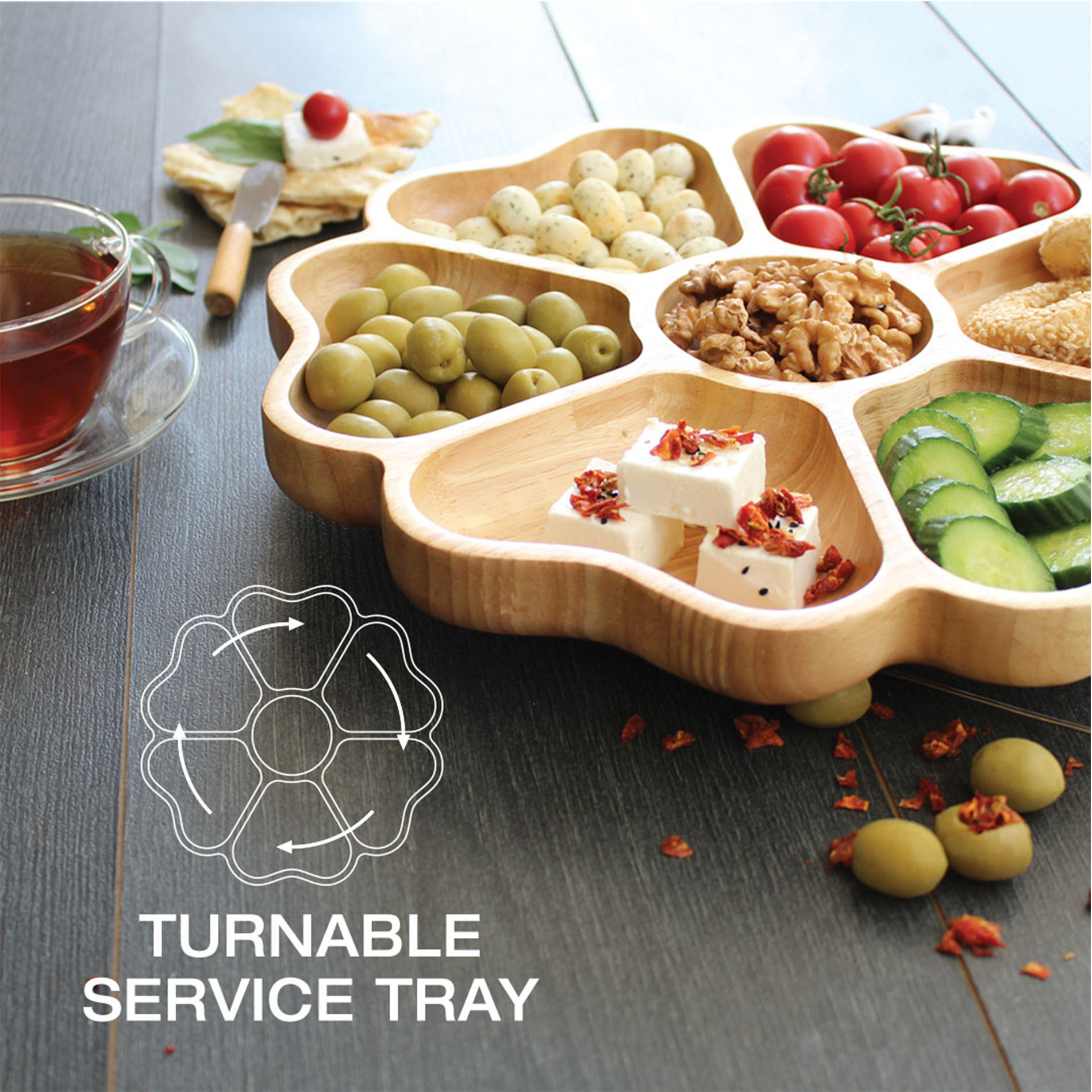 The rotating wooden serving tray is perfect for serving multiple dishes in style. Made from high-quality beechwood, it provides a natural and elegant way to present food while enhancing the look of any table setting. With a robust, chemical-free coating, it ensures safe and health-conscious food presentation and is ideal for both daily use and special occasions.