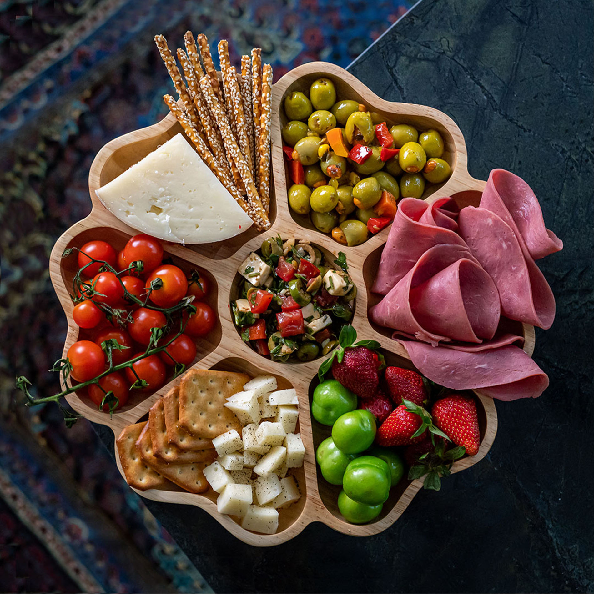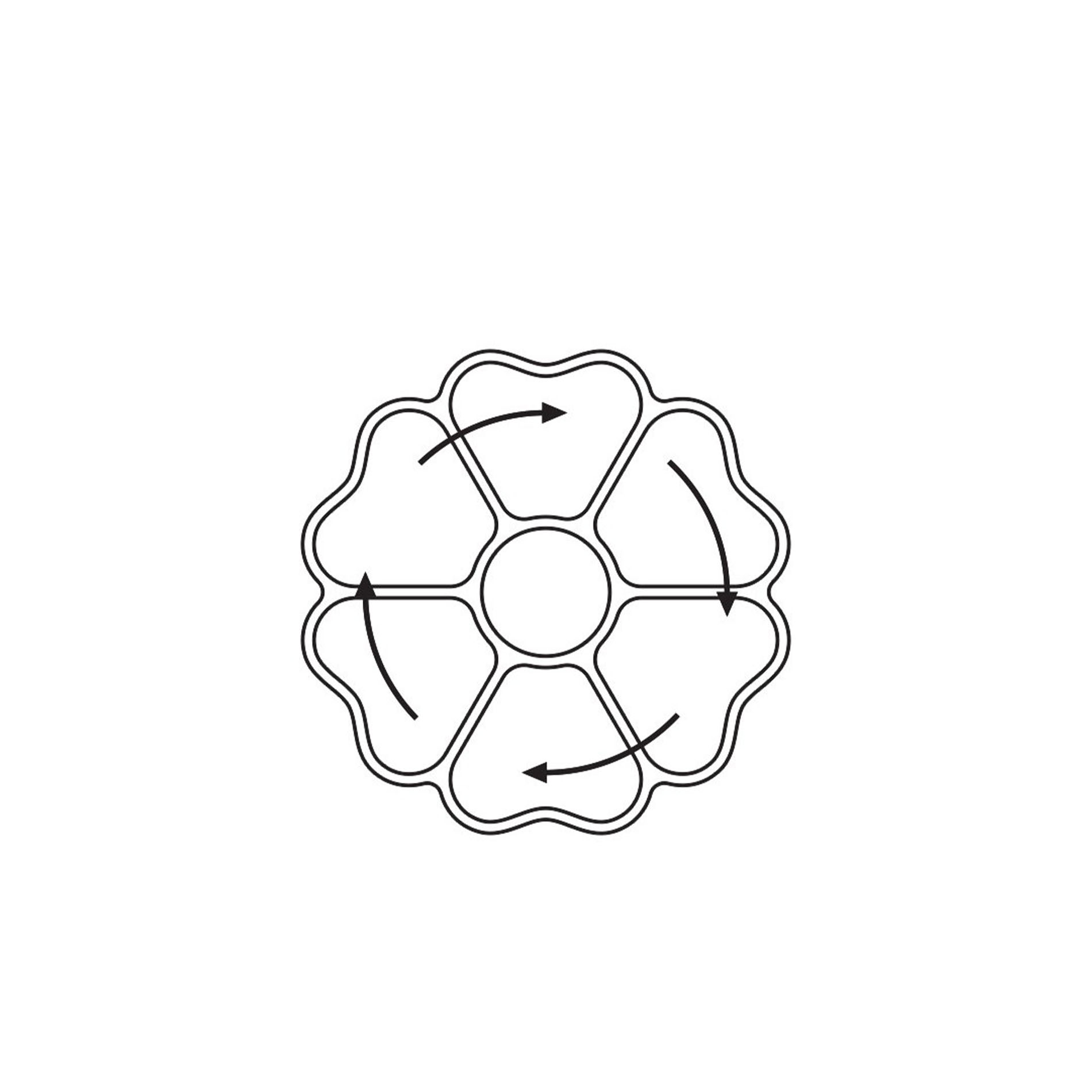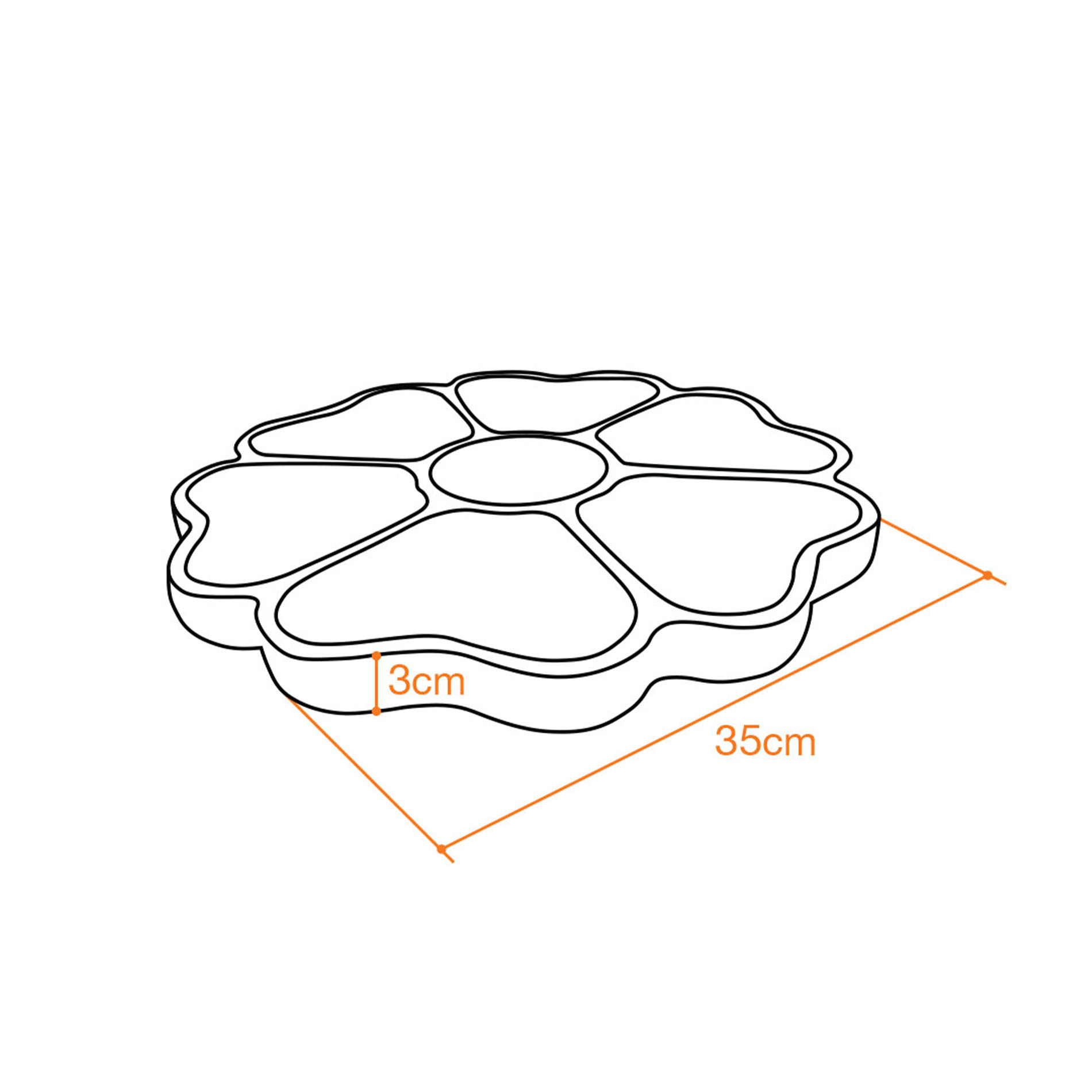 The seven-piece model is round, with six evenly spaced sections and a small central area. It’s perfect for appetizers, snacks, or a variety of small dishes, making it a unique centerpiece for any gathering.